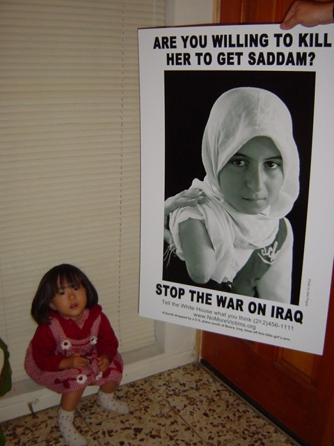 We created a poster that is spreading around the world and can be downloaded by accessing http://www.nomorevictims.org/24x36.pdf The poster features a powerful Alan Pogue photograph of an Iraqi girl who was injured in a US bombing raid south of Basra in April, 1999. Contact us for an editable version so you can create one in another language. From: http://www.indymedia.org/front.php3?article_id=216619&group=webcast