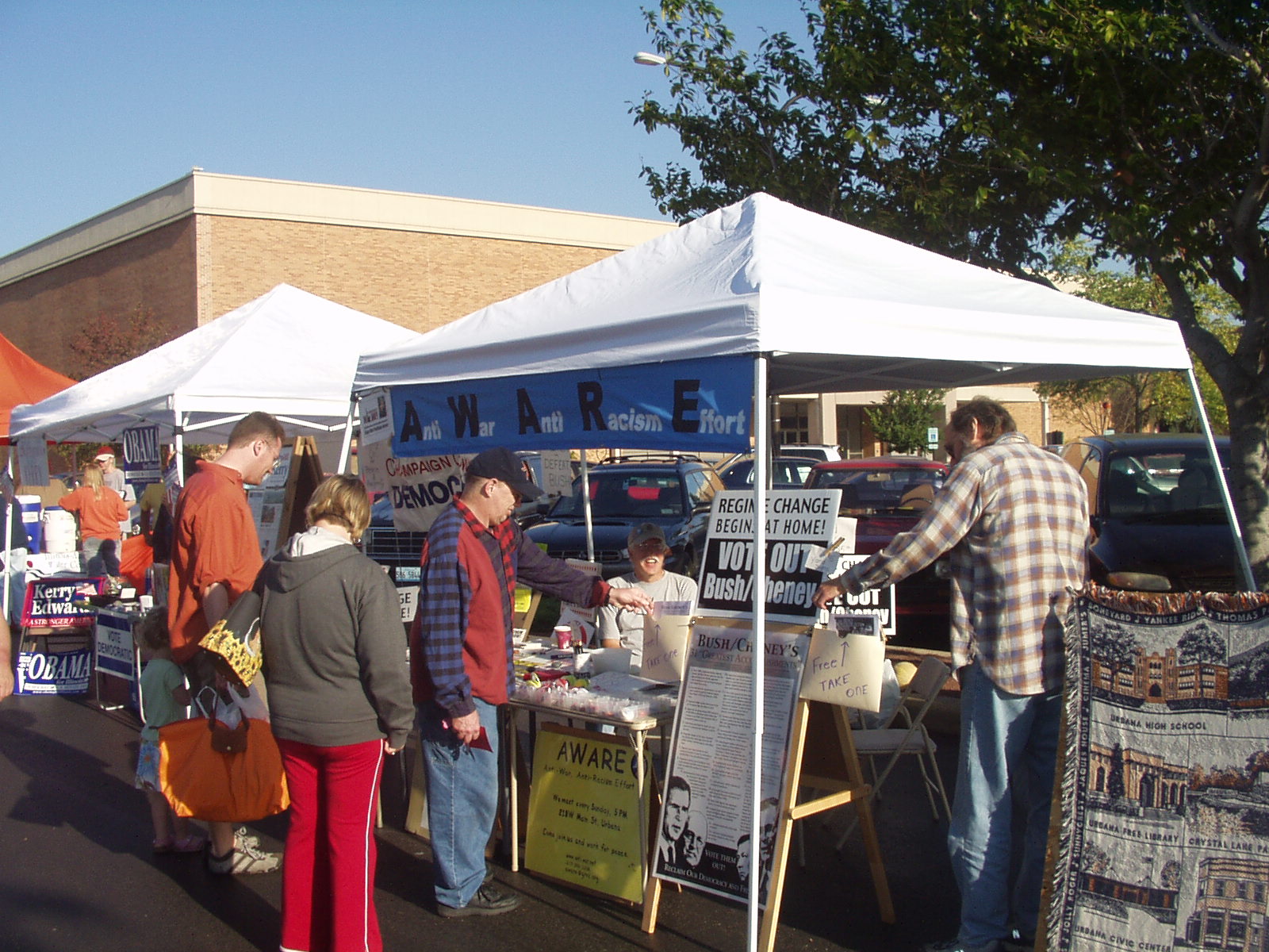 Each Saturday (7:00AM-Noon) from mid-May until mid-November AWARE members volunteer to table at Farmer's Market at the Lincoln Square Mall in Urbana. If you have seen our booth you may already know that we have lots of free literature and information. We also sell at cost yard signs, bumper stickers and buttons. Our on going themes are "Vote OUT" Bush, send a post card (postage paid) to Kerry to call for his position regarding the Iraq War to be less like Bush, a call for an end to wars in general, and to eliminate racism. Needless to say we have plenty of work to do.