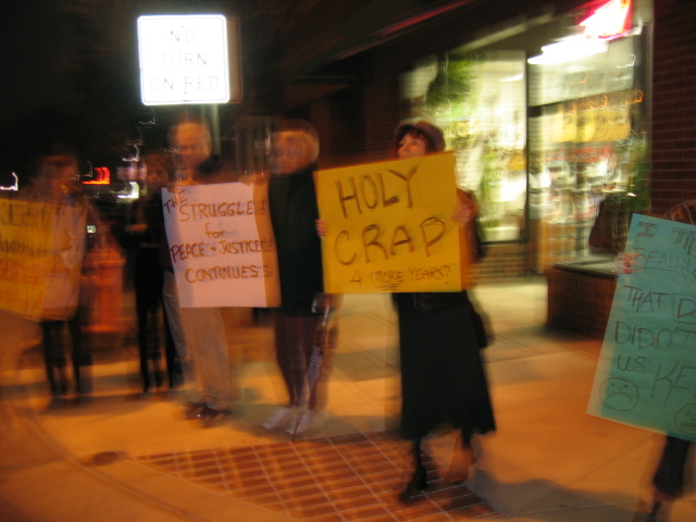 Scores of local community members took part in a hastily assembled Community Meeting and Social to discuss new projects, ideas, and strategies following the 2004 elections. Earlier in the evening community members rallied in the cold and rain at the corner of Race and Main Streets in downtown Urbana to demonstrate against the flawed American election system. Over a dozen projects were unveiled and discussed as people channeled their anger, their concern, and their disappointment -- vowing not to give up hope, lessen in their community engagement, or cease resisting discrimination and the diminution of our civil rights. |