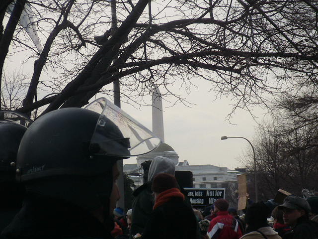 The only permitted protest was sponsored by A.N.S.W.E.R., the anti-war and racism group. Nonetheless, protestors lined up and down the parade route, in some places facing police aggression.