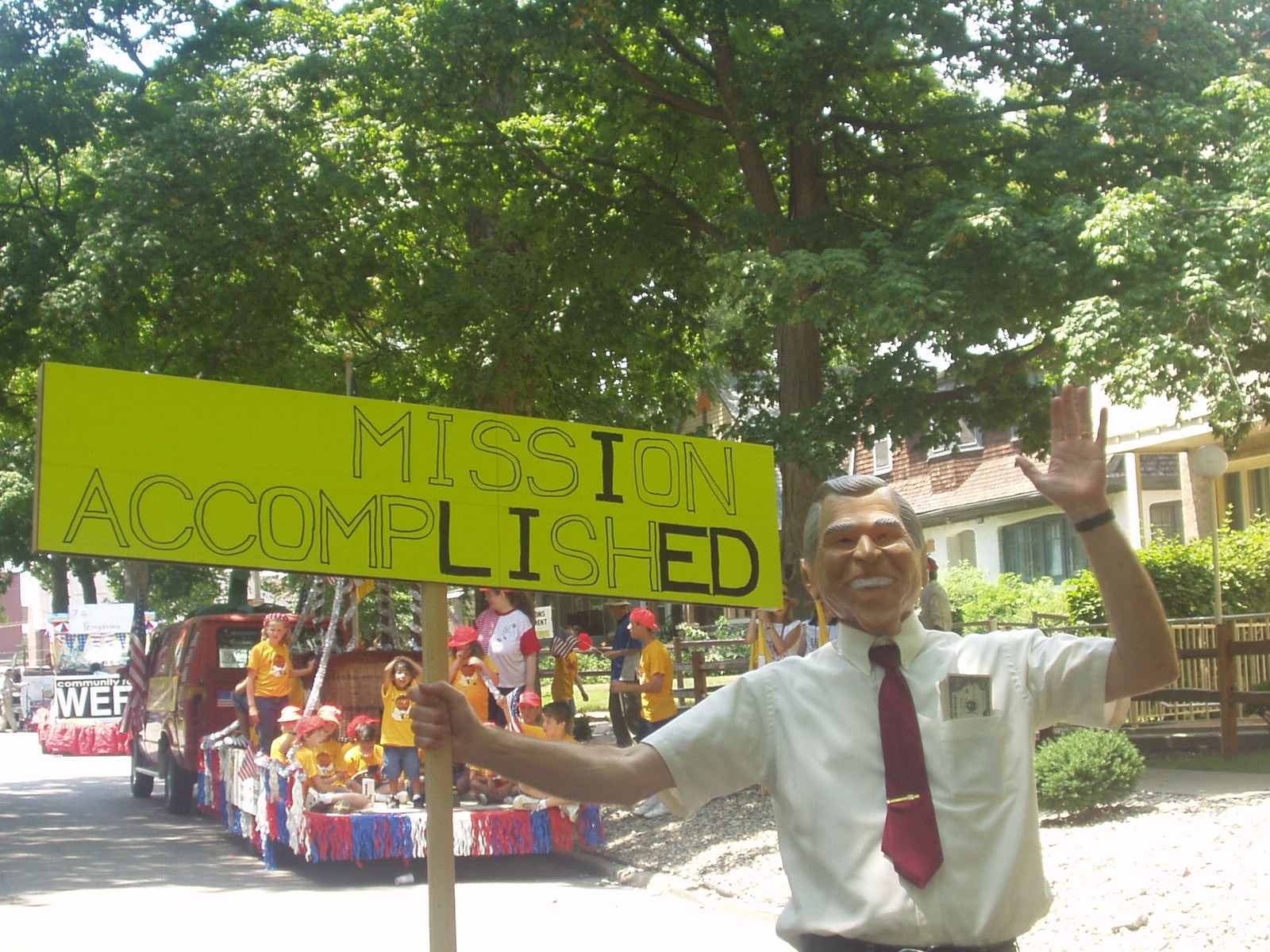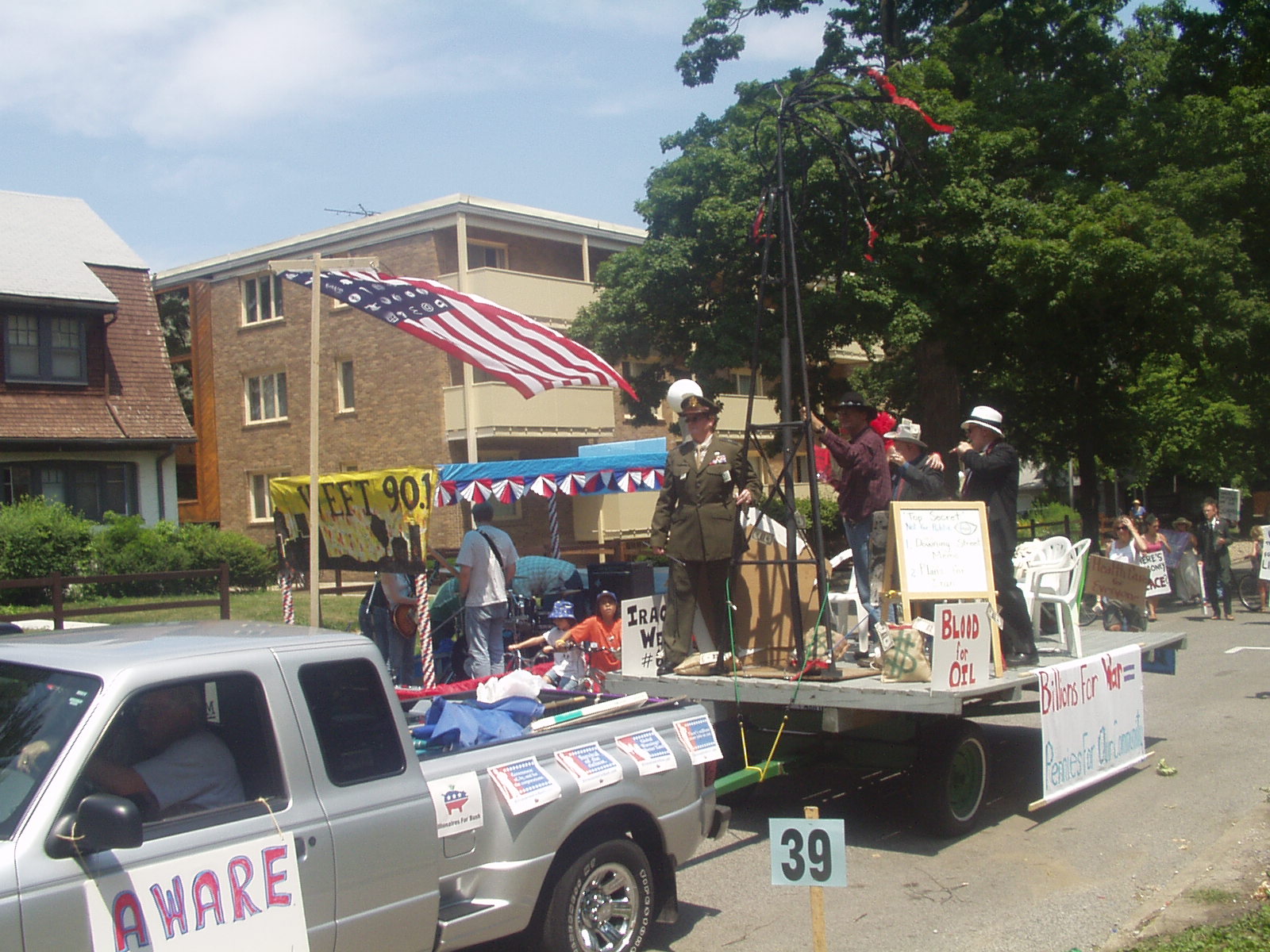 AWARE and friends marched with the community on July 4th. Well over 30 people joined the Billionaires for Bush. The Texas oil man, the rich folks and the General all got to ride while those seeking justice had to walk behind.