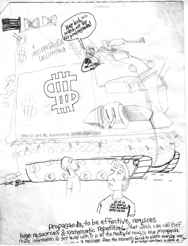 yeah, this stuff ain't commin out from a vacuum from some greenhorn. Since '91 the author has been raisin radical creativeness to new heights. Maybe you heard about 'im raisin wildness in Boston ('91-'93), or at the March on Wash ington (d.c.) in '93 as 'a ghost of BLs' Past' (including megaphone attached to ten-foot pole); or maybe the OLF action in '95 in MN, MN. One thing's for sure, the crea tivity has been gettin less alienated! Now with over 20 localities under 'is action belt and more than 30 different spontaneous actions and reflections, the word ballistic can *almost* be inserted. (details kept intentionally indirect) One-man band or not, the crucial art thang *haz gotta hav* across-the-spectrum input to become truly inspiring in a big way...
