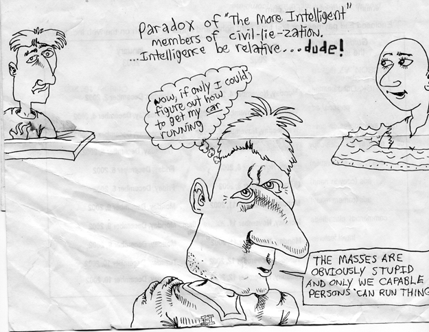 Studying the fears, the bigoted assumptions, the topical understandings without contexts, without empathy (in a direct reflection of what little empathy they reserve for themselves!) we begin to see that these supposedly wise persons are not much wiser than us.(1) Perhaps the "captains of industry" and architects, planners, strategists, "elite" implementers of policy, and even "owners" of states are 'capable' in how they've been trained within such deadening imagination momentums --perhaps even *geniuses* in their own ways-- yet utter beginners in others. Like the artwork below of the guy who doesn't know anything about how to fix his car!