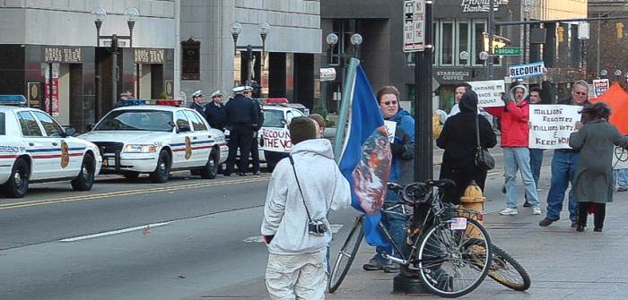 Bring signs, American flags, noisemaking pots and pans, tambourines, props, etc. warm clothes and a tent if you have one or can borrow one. We are prepared to picket and stay until we have a fair election. No more stolen elections!!! Bring your chants and songs. We will tent camp for freedom and fair elections. We are especially asking veterans to come in uniform if possible, because we feel you have an elevated status by having fought for freedom. Come by on your lunch hour or whenever you can make it and bring clothes and sleeping bags to donate. Mainly we need many people to show up ready to stop Ken Blackwell from stealing our election.