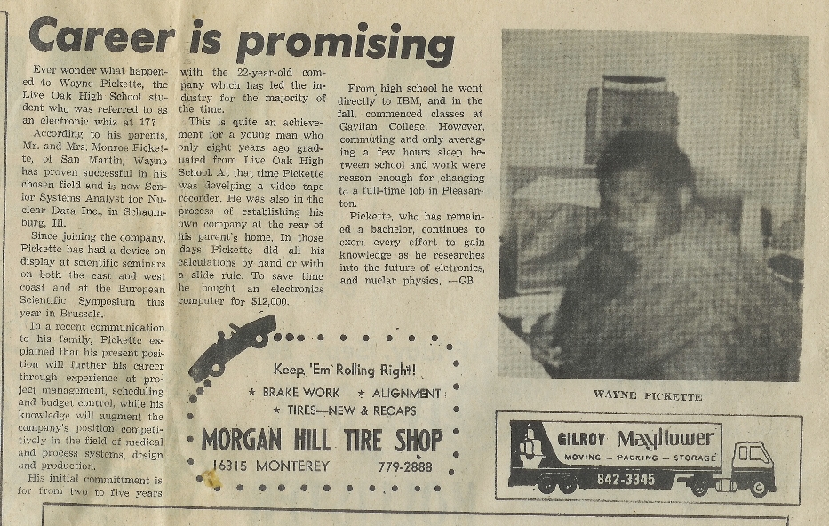 Attached is a scan of an article on Wayne Pickette that appeared in the September 21, 1976 Morgan Hill Times (California), approximately one year after Wayne stopped working for Intel. (Wayne left Intel on August 15, 1975.) The article is based on an interview that the newspaper conducted with Wayne's parents, and includes a photograph of Wayne at age 17, at his parent's home, with his recently purchased PDP-8/S computer. The computer was purchased at the August 1967 Western Electric Show and Convention (Wescon) in San Francisco, California.